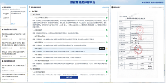成功数字构建AI辅助审批智能体,汇集80余项智能化辅助审批要点和算法规则,实现环评报告表一键上传后,15分钟完成智能审查,自动输出环评质量审核问题清单